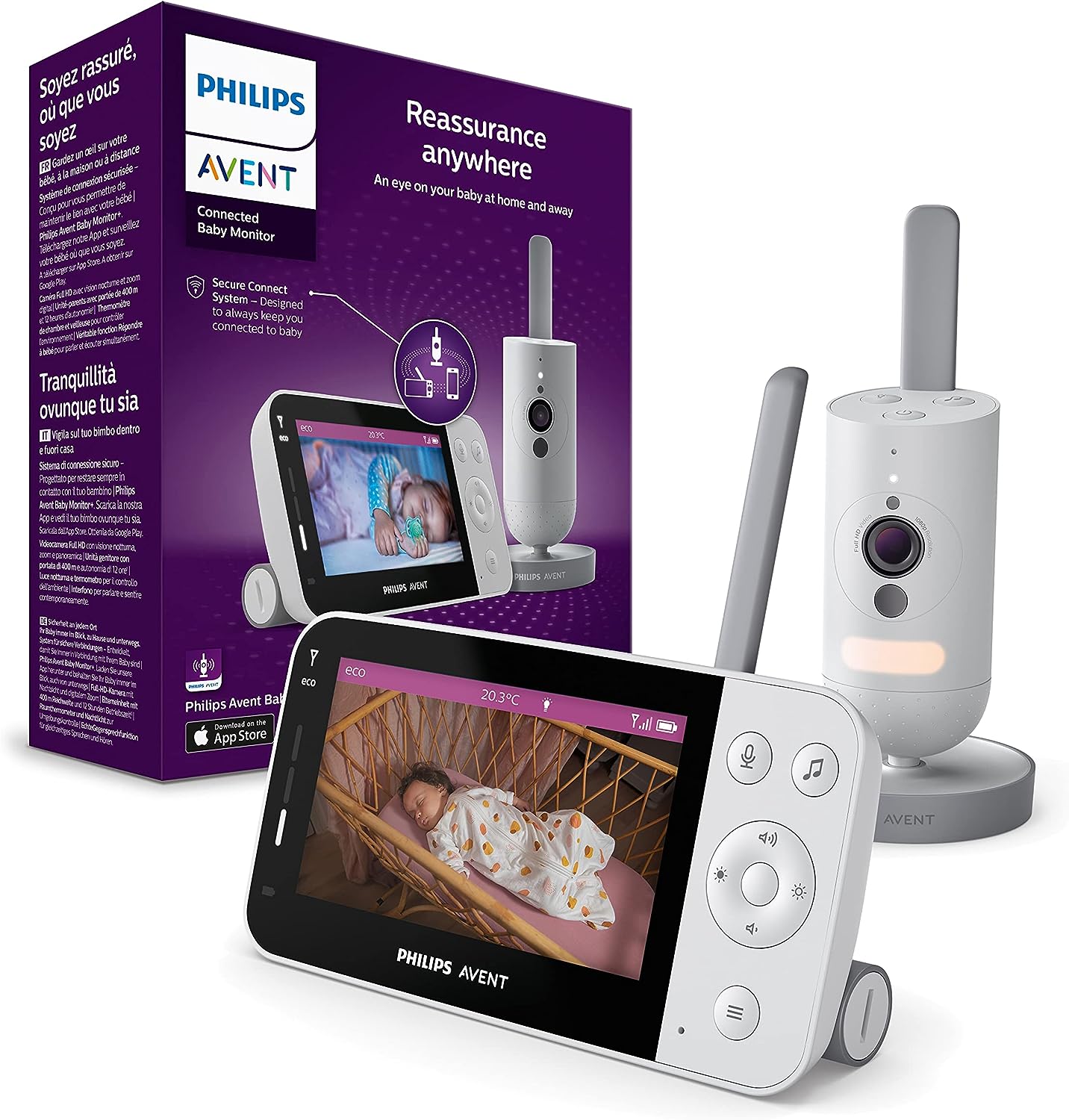 Nuestro sistema de conexión segura lo mantiene vinculado a su pequeño en toda la casa. Y con la aplicación Baby Monitor + puede conectarle desde cualquier lugar.